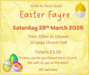 Easter Fayre in the Large Hall 10am till 12 noon tickets £3.50 or pay at the door |